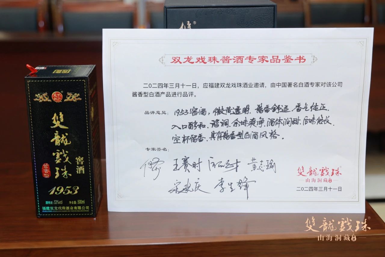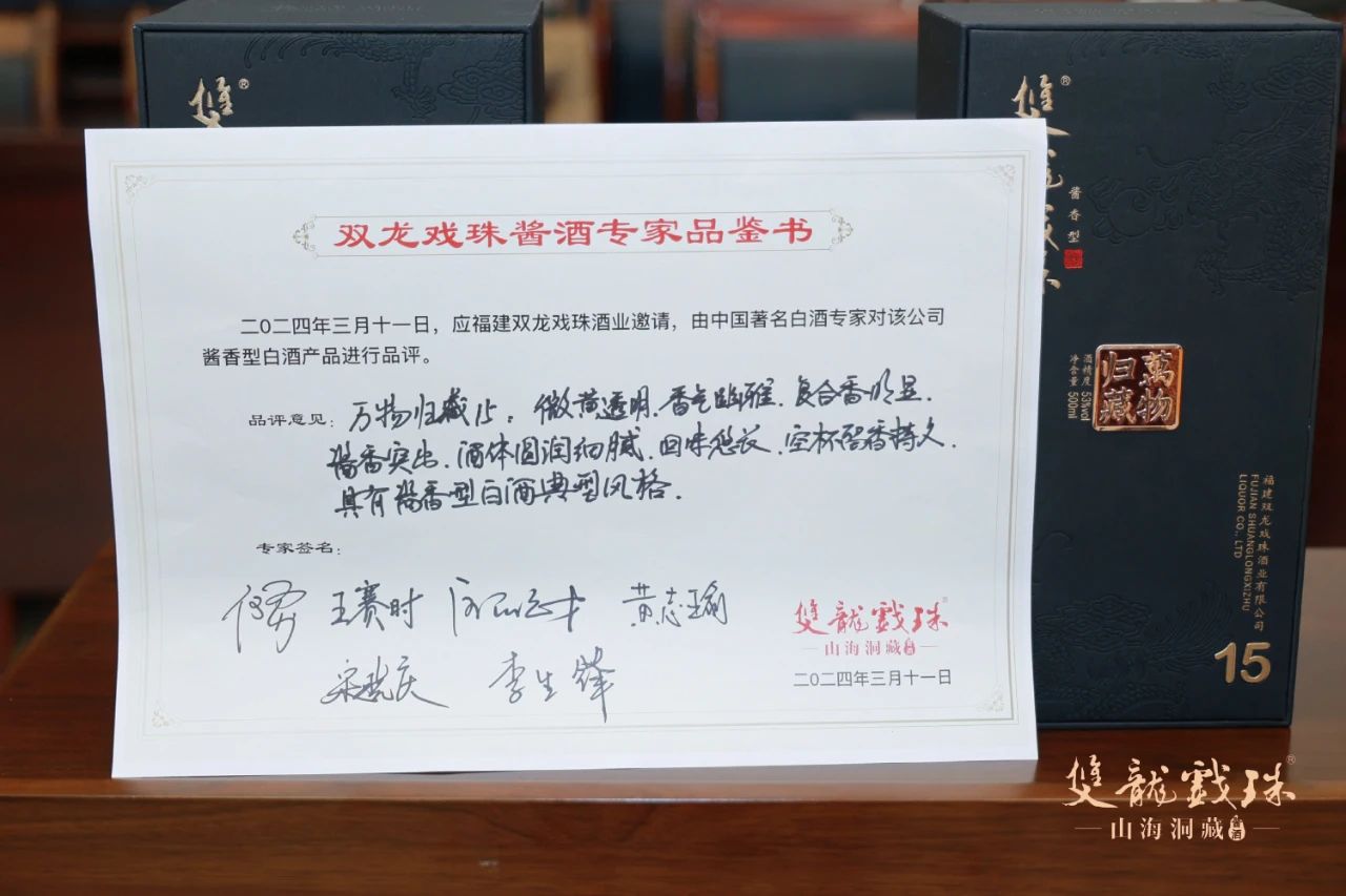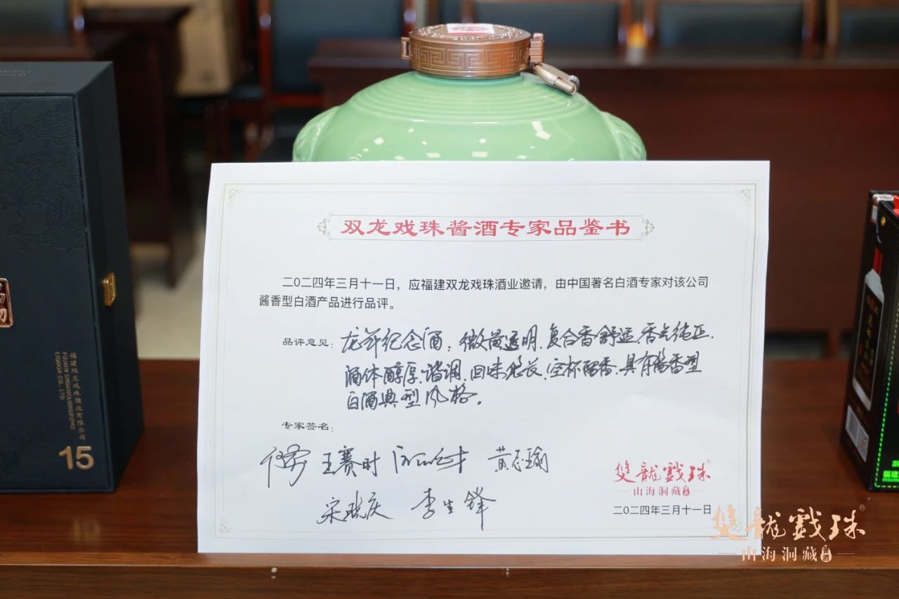 3月11日,中國(guó)酒業(yè)協(xié)會(huì)秘書長(zhǎng)何勇、中國(guó)酒史學(xué)家王賽時(shí)、國(guó)家一級(jí)品酒師黃志瑜、國(guó)家一級(jí)品酒師宋曉慶、國(guó)家白酒評(píng)委歐陽元財(cái)、福建雙龍戲珠酒業(yè)有限公司總工程師李生鋒六位專家齊聚雙龍戲珠,對(duì)雙龍戲珠萬物歸藏15、1953窖酒、龍年紀(jì)念酒進(jìn)行了現(xiàn)場(chǎng)權(quán)威鑒評(píng),并給出了綜合評(píng)價(jià)。